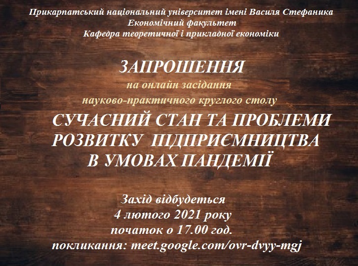 Лют 01 Онлайн науково-практичний круглий стіл “Сучасний стан та проблеми розвитку підприємництва в умовах пандемії”