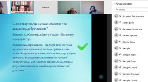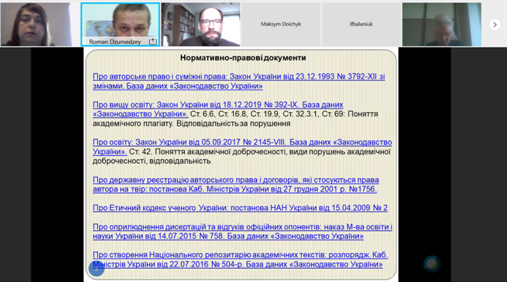 Комісія з питань етики та академічної доброчесності спільно з Науковою бібліотекою ПНУ в рамках занять університетської школи академічної доброчесності 21 квітня 2021 р. провели онлайн-семінар «Академічна доброчесність та її інструменти».