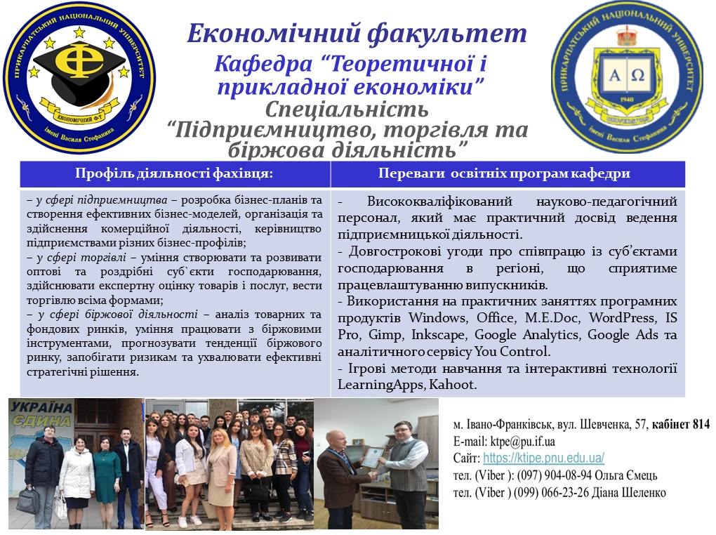 28 травня відбувся День відкритих дверей Економічного факультету, де була представлена освітня програма “Підприємництво, торгівля та біржова діяльність”. Професорсько-викладацький склад проінформував майбутніх абітурієнтів про особливості вступу на освітню програму: Які умови? Що потрібно здавати? Які особливості навчання? Які є освітні Читати далі