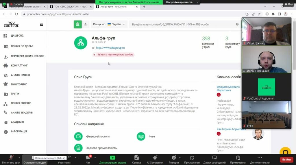 На лекції дізнались про недоліки, які містять державні реєстри і які чинники ускладнюють опрацювання даних. Навчились визначати “російський слід” в діяльності бізнесу, обирати компанії, які належать до холдингу/групи, визначати бенефіціарів.