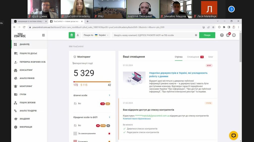 18 березня 2024 року бакалаври та магістри спеціальності 076 Підприємництво та торгівля Прикарпатського національного університету імені Василя Стефаника послухали гостьову лекцію від наших партнерів, яку організувала доц. Ольга Ємець через комунікацію з менеджеркою освітнього напряму компанії YouControl Терезою Вергелесовою.