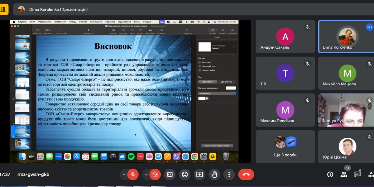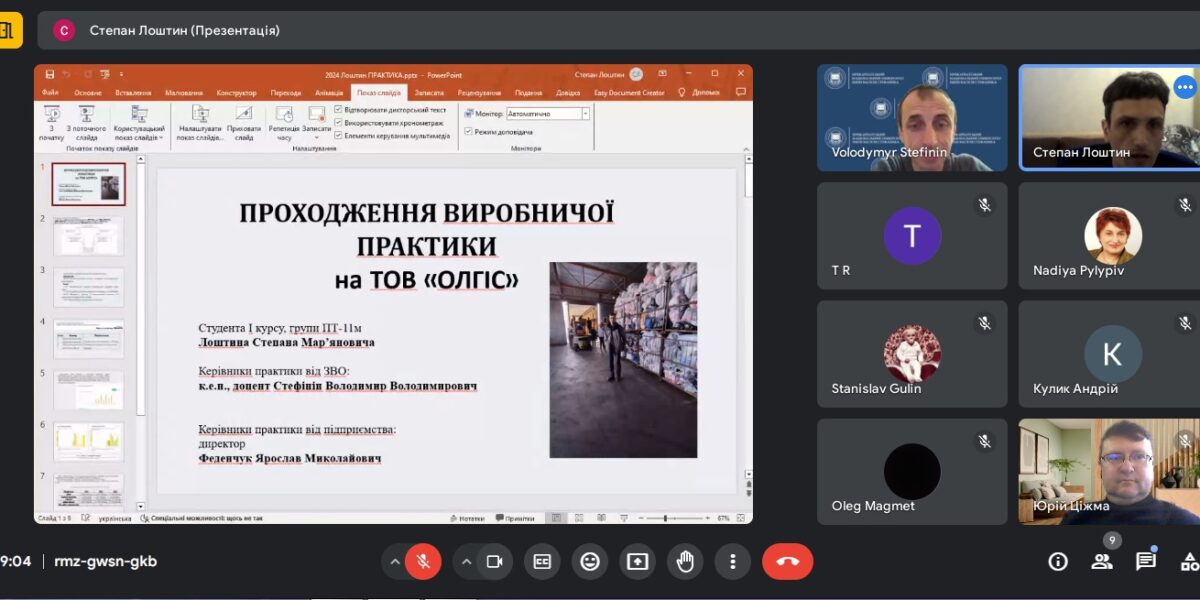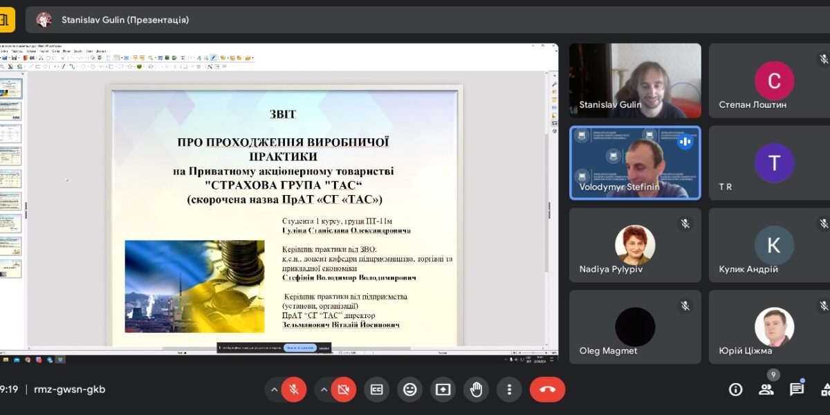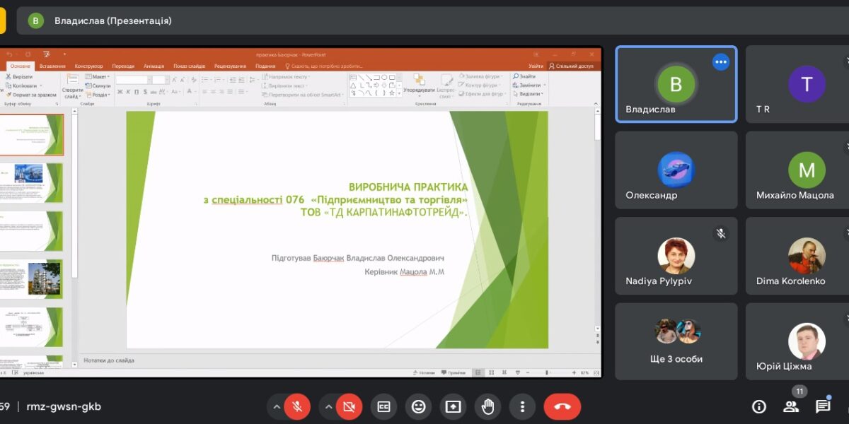 Комісія з числа професорсько-викладацького складу кафедри підприємництва, торгівлі та прикладної економіки д.е.н., проф. Пилипів Н.І., к.е.н., доц. Ємець О.І., к.е.н., доц. Мацоли М.М., к.е.н., доц. Стефініна В.В., к.е.н., доц. Ціжми Ю.І. та к.е.н., доц. Романюка Т.М. у режимі відеоконференції мала можливість заслухати доповіді магістрів груп ПТ-М11 та ПТ-М12 ОПП «Підприємництво та торгівля» щодо результатів проходження виробничої практики.