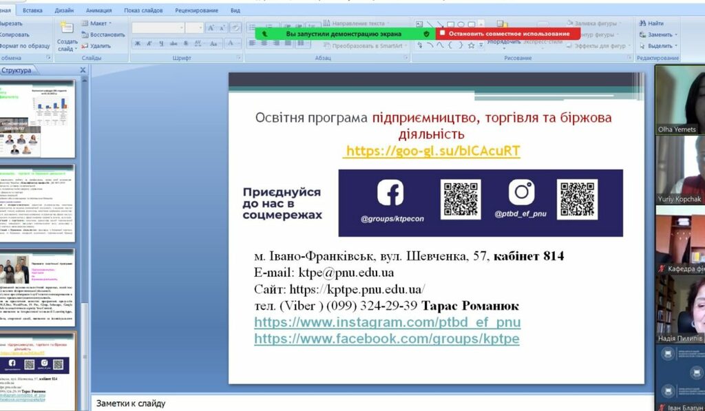 10 квітня 2024 р представники кафедри підприємництва, торгівлі та прикладної економіки економічного факультету Прикарпатського національного університету імені Василя Стефаника доєднались на профорієнтаційну онлайн зустріч з опорним ліцеєм селища Більшівці Більшівцівської ТГ.