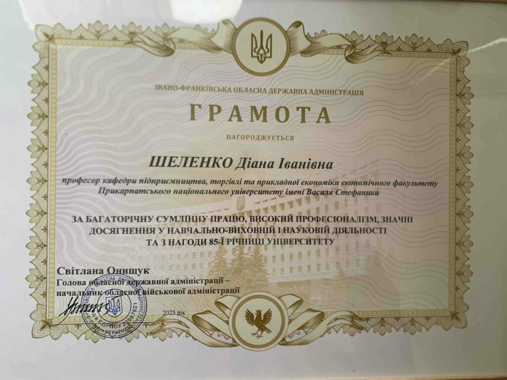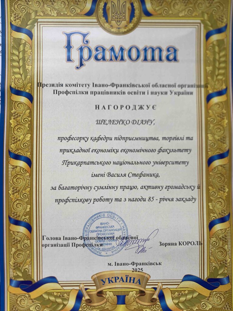 Щиро вітаємо Шеленко Діану, професорку кафедри підприємництва, торгівлі та прикладної економіки економічного факультету Прикарпатського національного університету імені Василя Стефаника, з почесною Грамотою президії комітету Івано-Франківської обласної організації Профспілки працівників освіти і науки України! Нагороду вручено за: багаторічну сумлінну працю, активну Читати далі