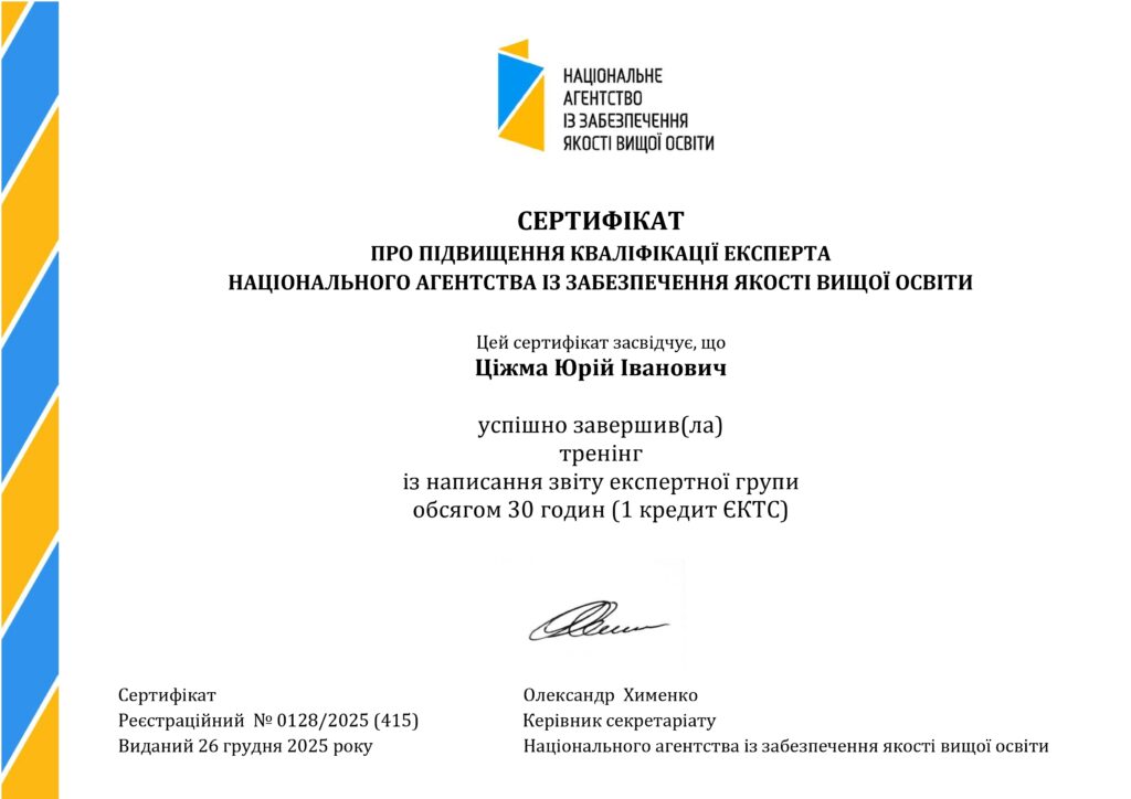 Доцент Юрій ЦІЖМА пройшов підвищення кваліфікації як експерт Національного агентства із забезпечення якості вищої освіти