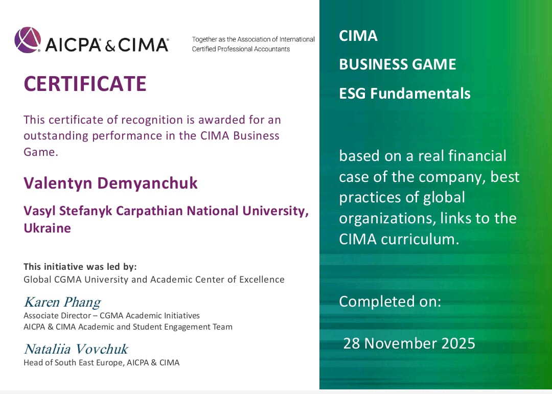 Завершився VI міжнародний тур #AICPA & #CIMA Business Game, де команда Карпатського національного університету імені Василя Стефаника продемонструвала високий рівень підготовки. Серед 24 закладів вищої освіти України наш університет виборов почесне 6-те місце.