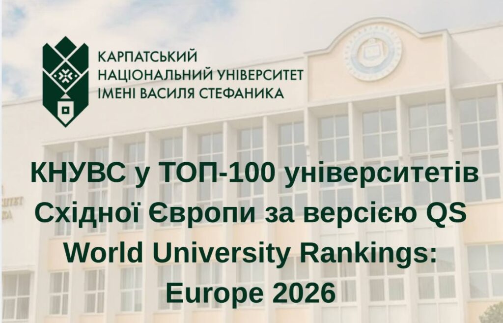 Карпатський національний університет імені Василя Стефаника вперше в історії увійшов до одного з найпрестижніших міжнародних рейтингів – QS World University Rankings: Europe 2026, що є знаковою подією для всієї університетської спільноти. Це досягнення засвідчує високий рівень академічної та наукової спроможності університету, його поступову інтеграцію до Європейського простору вищої освіти та зростання міжнародного визнання.