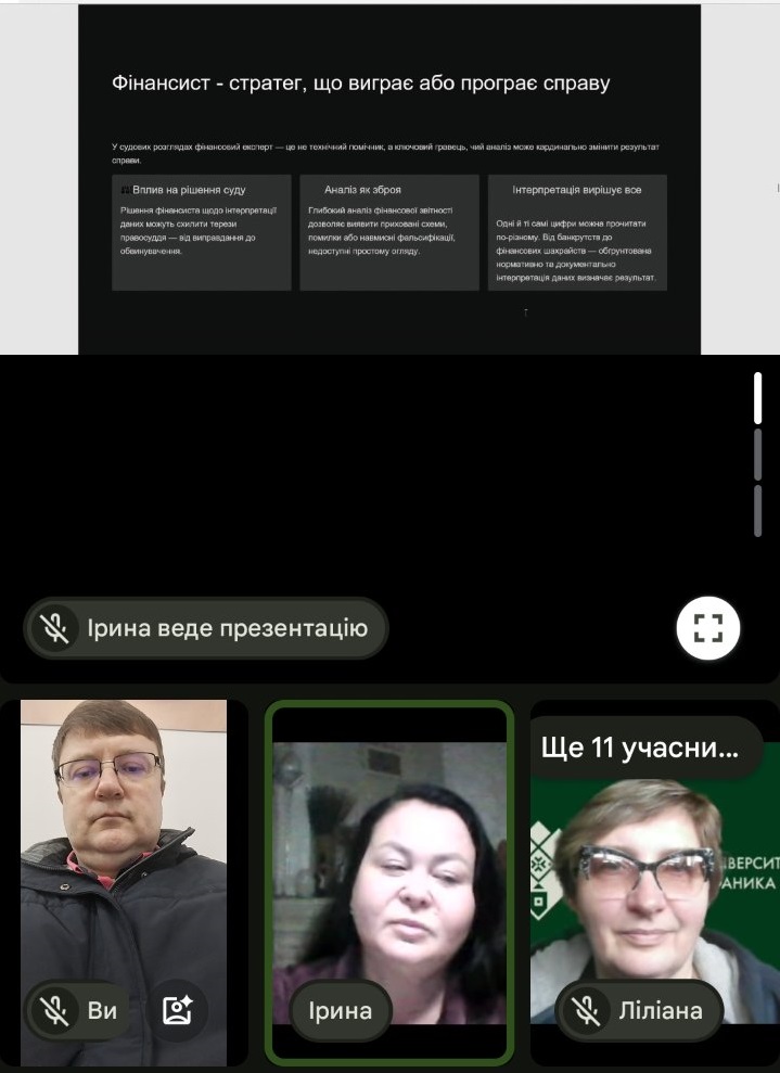 Методика викладання лекції передбачила ознайомлення студентів з методологією дослідження збитків підприємства та визначення типових помилок у висновках експерта. І, звісно, не уникнула лектор, проф. Перевозова І.В., актуального питання застосування штучного інтелекту при проведенні експертизи.