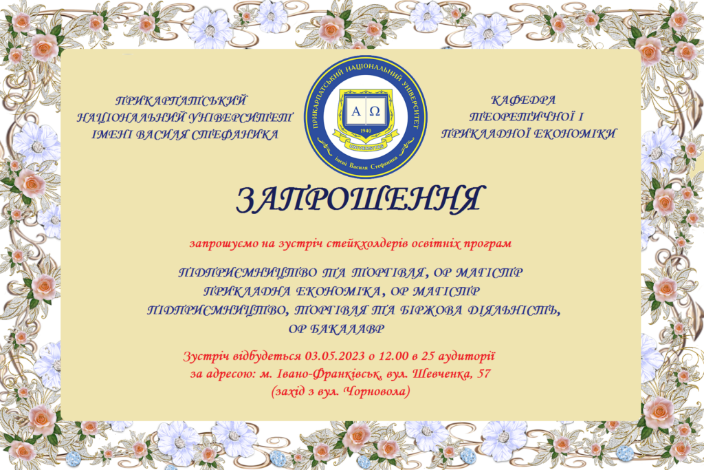 У середу, 3 травня 2023 року, кафедра теоретичної і прикладної економіки провела зустріч зі стейкхолдерами освітньої програми першого (бакалаврського) рівня вищої освіти «Підприємництво, торгівля та біржова діяльність» та освітніх програм другого (магістерського) рівня вищої освіти «Прикладна економіка» та «Підприємництво та Читати далі