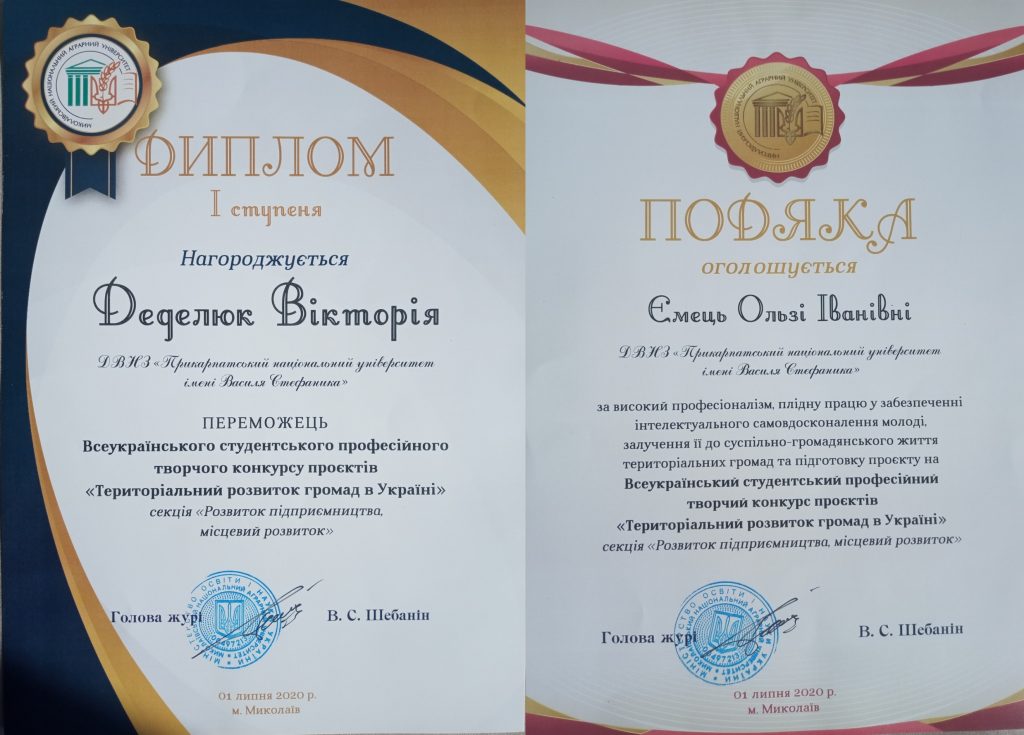 Щиро вітаємо Деделюк Вікторію та її наукового керівника – доц. Ємець Ольгу Іванівну з перемогою у Всеукраїнському студентському професійному творчому конкурсі проєктів «Територіальний розвиток громад в Україні»